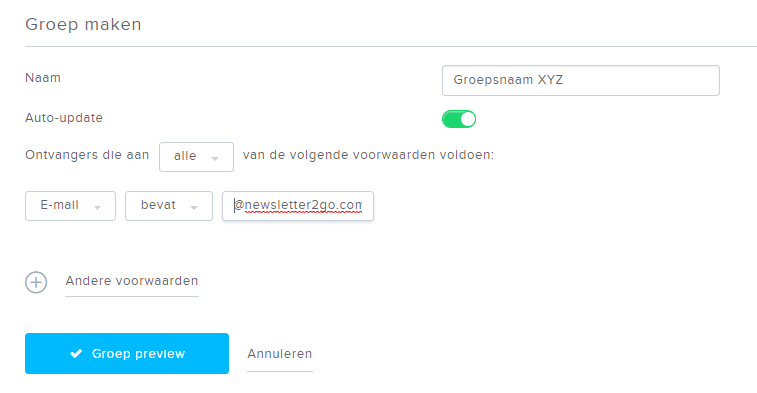 Voorbeeld: U wilt alle ontvangers met dezelfde e-mailproviderdomein in een groep opslaan (bijvoorbeeld @newsletter2go.com).